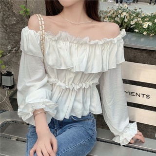 Áo Trễ Vai Trắng Dài Tay Bèo 2 Tầng - Áo Hở Vai Nữ Bánh Bèo Siêu Xinh
