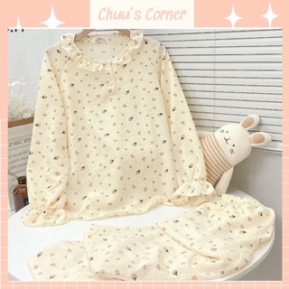 Đồ bộ nữ pijama mặc nhà vải đũi xốp viền bèo hoạ tiết dễ thương, đồ ngủ tay vải mát