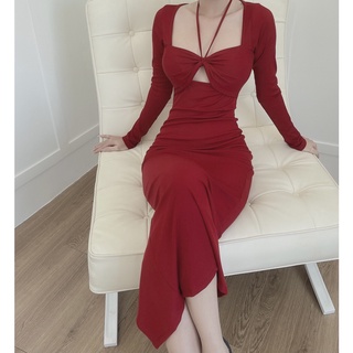 [HÀNG THIẾT KẾ CAO CẤP] Đầm Body Thun Gân Tay Dài Khoét Ngực Sexy Tôn Dáng Màu Đỏ Đi Tiệc Sang Trọng