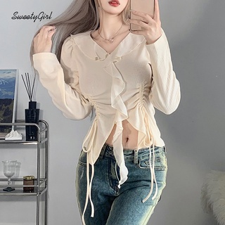 Áo Croptop Dệt Kim Tay Dài Cổ Chữ V Màu Trơn Phong Cách Đường Phố Thời Trang Dành Cho Nữ