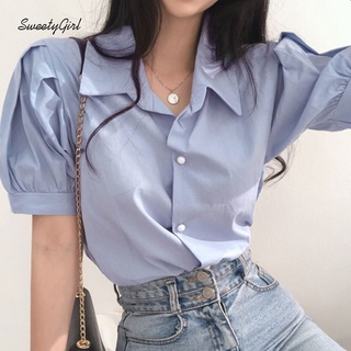 Áo Sơ Mi Tay Phồng Ngắn Cổ Bẻ Cài Nút Màu Trơn 2022 Thời Trang Cho Nữ
