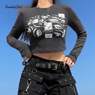 Áo Thun Tay Dài Cổ Tròn In Hình Đôi Mắt Hoạt Hình Dành Cho Nữ