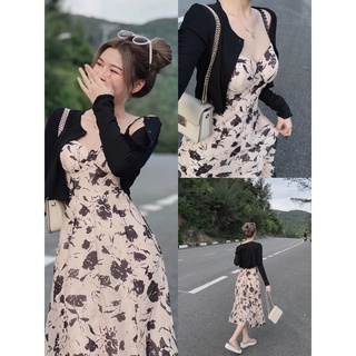 Váy hai dây nền hoa có mút kèm áo khoác thời trang nữ dự tiệc dạ hội sang chảnh