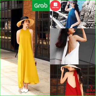 Đầm maxi cổ yếm dáng dài hở lưng có mút ngực hợp thời trang đi biển,du lịch XUKA-DRESS MT061 chất Lụa đẹp hàng 2 lớp