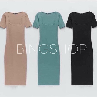 Váy body tay lỡ cổ vuông Bingshop dáng dài vải tăm co dãn
