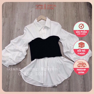 Áo sơ mi tay bồng phối đen trắng