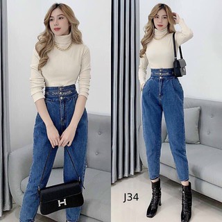 Quần jean ngố lưng cao có độ co dãn chất vải jean dày dặn kiểu lưng đinh eo