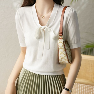 Áo Dệt Kim Ngắn Tay Thời Trang Nữ Tính 165782 Áo Thun Dáng Ôm Đính Nơ Đơn Giản Thời Trang Dễ Phối Đồ