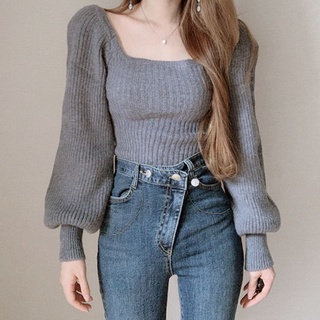 Áo kiểu RENJIANVSHENG 206854 dệt kim tay dài phồng cổ vuông ôm dáng vừa vặn thời trang Hàn Quốc xinh xắn cho nữ