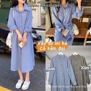 (Ảnh thật) Đầm sơ mi kẻ sọc thoáng khí thời trang mùa thu Pháp, Váy sơ mi dáng suông kèm đai