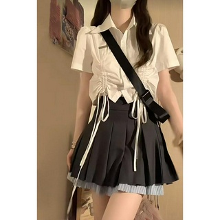 Set Áo Dây Rút Ngắn Tay Phối Chân Váy Xếp Ly Ngắn Thời Trang Sành Điệu 6523