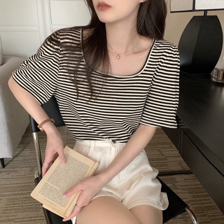 Áo Thun Tay Ngắn Cổ Vuông Dáng Rộng Họa Tiết Kẻ Sọc 51265 Thời Trang Cho Nữ