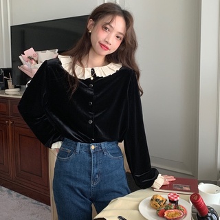 Áo sơ mi peppermint 48427 tay dài chất liệu nhung mềm mại phong cách ngọt ngào cho nữ