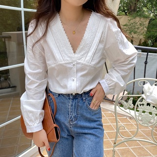 Áo sơ mi trắng PEPPERMINT 45383 dài tay cổ chữ V phối ren thanh lịch phong cách Hàn Quốc