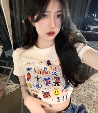 Áo Thun Dáng Ôm Cổ Tròn Ngắn Tay In Hoạt Hình Thời Trang Mùa Hè Năng Động 63739