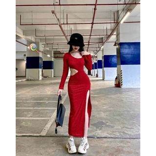 Đầm tay dài thun gân khoét bên eo dáng dài body xẻ tà cực hot , chất thun gân mềm mịn
