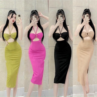 Đầm khoen giữa yếm đeo cổ khoét dưới ngực ôm body xẻ tà cực xinh , chất thun gân dày dặn mk