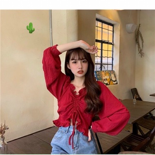 Áo kiểu tay dài viền bèo rút dây giữa cực xinh , chất kate mềm mịn mát