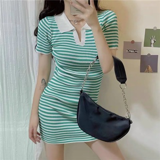 Đầm cổ bẻ V tay ngắn sọc ngang ôm body cực xinh , chất thun gân mềm mịn mk