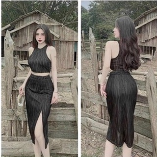 Sét bộ xốp áo 3 lỗ croptop phối chân váy dài body xẻ tà cực xinh , chất thun xốp mềm mát ly