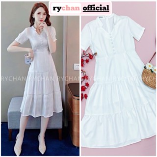 Đầm Trắng Xòe Cổ Vuông Nút Bọc Tay Lở Lót Trong Dày Dặn - DX964
