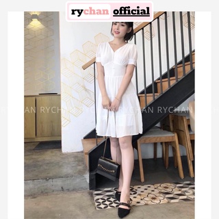 DX617 - Đầm Xòe Trắng Cổ V Phối Nút Tay Phồng