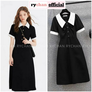 [ẢNH THẬT CUỐI] Đầm Nữ Cổ Sơ Mi Tay Ngắn Viền Trắng Nút Trước Thanh Lịch, Đầm Đi Làm Dáng Xòe Cổ Trắng Màu Đen - DX169