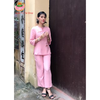 Quần áo đi chùa, áo dài đi chùa, Bộ Cách Tân Đi Chùa Hai Lớp Đũi Mềm Cao Cấp Phối Mầu Hồng Hoa Sen Mới
