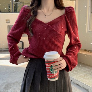 Áo Thun Tay Dài Phồng Cổ Chữ V Ôm Dáng Phong Cách Hàn Quốc Thời Trang Xuân Thu Mới