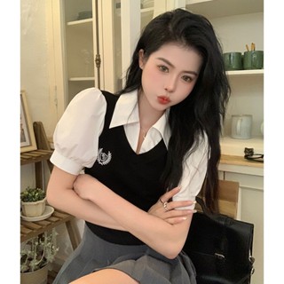 Áo Thun Ngắn Cổ Chữ v Giả Hai Lớp Màu Tương Phản Phong Cách Mới Mùa Hè Cho Nữ