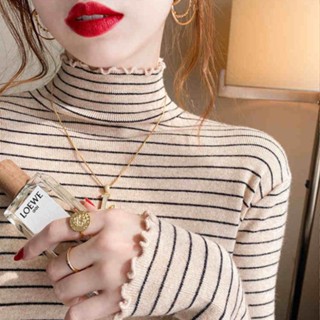 Áo Thun Dài Tay Cổ Cao Họa Tiết Kẻ Sọc Thời Trang Thu Đông Hàn Quốc Mới