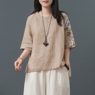 Áo Thun Cotton Lanh Thêu Họa Tiết Đơn Giản Phong Cách Retro Thời Trang Mùa Hè Cho Nữ