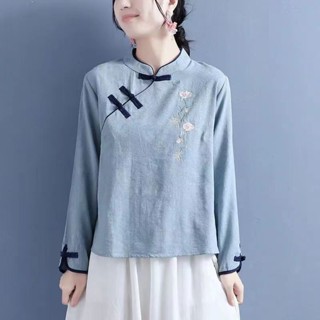 Áo Sơ Mi Vải Lanh Cotton Tay Dài Cổ Đứng Cài Nút Thêu Họa Tiết Phong Cách Trung Hoa Cổ Điển Thời Trang Cho Nữ