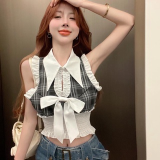 Áo Kiểu Không Tay Phối Nơ Họa Tiết Sọc Caro Quyến Rũ Thời Trang