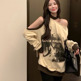 Áo Thun Tay Dài Trễ Vai Dáng Rộng In Chữ Thời Trang Mùa Thu