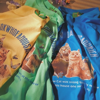 Áo Thun Nữ Tay Ngắn In Hình Mèo Phong Cách Retro