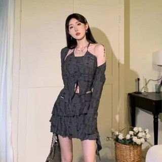 Set Áo Khoác Lửng Dài Tay + Áo Hai Dây + Chân Váy Chữ A Phong Cách Hàn Quốc Thời Trang Dành Cho Nữ