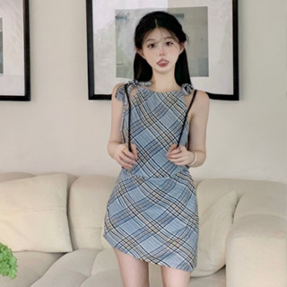 Đầm Hai Dây Ôm Dáng Họa Tiết Caro Đính Nơ Phong Cách Hàn Quốc Quyến Rũ Cho Nữ