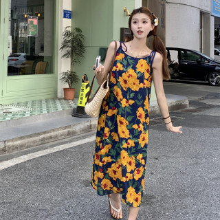 Đầm Dài Dáng Chữ A Không Tay Dáng Rộng In Họa Tiết Hoa Phong Cách Hàn Quốc Thời Trang Đi Biển Cho Nữ