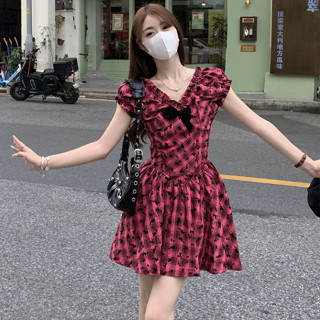 Đầm Nữ Tay Ngắn Cổ Chữ V Họa Tiết Caro Thời Trang Quyến Rũ