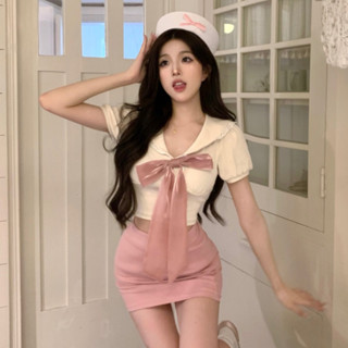 Bộ Áo Ngắn Tay Đính Nơ Ôm Dáng + Chân Váy Lưng Cao Thời Trang Hàn Quốc Cho Nữ