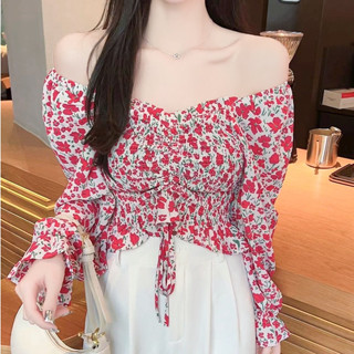 Áo Voan Hoa Trễ Vai Cổ Chữ V Phối Dây Rút Gợi Cảm Cho Nữ