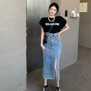 Set Áo Thun Ngắn Tay Cổ Tròn Màu Trơn In Chữ + Quần Jeans Dài Lưng Cao Xẻ Tà Thời Trang Hàn Cho Nữ