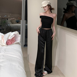 Set Áo Lửng Trễ Vai Không Tay + Quần Dài Lưng Cao Ống Rộng Thời Trang Hàn Quốc Quyến Rũ Cho Nữ Đen