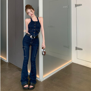 Set Áo Denim Không Tay Ôm Dáng + Quần Denim Lưng Cao Ống Loe Thời Trang Hàn Quốc Cho Nữ