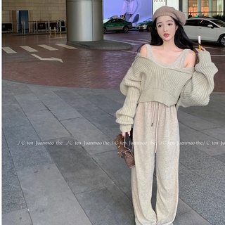 Set Áo Thun Tay Dài Cổ Tròn + Áo Hai Dây + Quần Dài Lưng Cao Phong Cách Hàn Quốc Cho Nữ