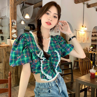 Áo Sơ Mi Nữ Tay Ngắn Cổ Chữ V Họa Tiết Caro Thời Trang Quyến Rũ