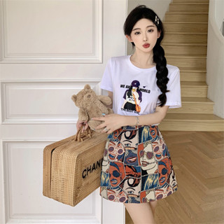 Bộ Áo Thun Ngắn Tay Cổ Tròn In Họa Tiết Hoạt Hình + Chân Váy Chữ A Lưng Cao Thời Trang Cho Nữ