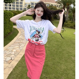 Bộ Áo Thun Ngắn Tay Cổ Tròn In Họa Tiết Hoạt Hình + Chân Váy Eo Cao Xẻ Tà Thời Trang Mùa Hè Trung Hoa Dành Cho Nữ