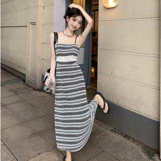 Đầm Dài Hai Dây Dáng Ôm Họa Tiết Kẻ Sọc Thời Trang Hàn Quốc Quyến Rũ Cho Nữ